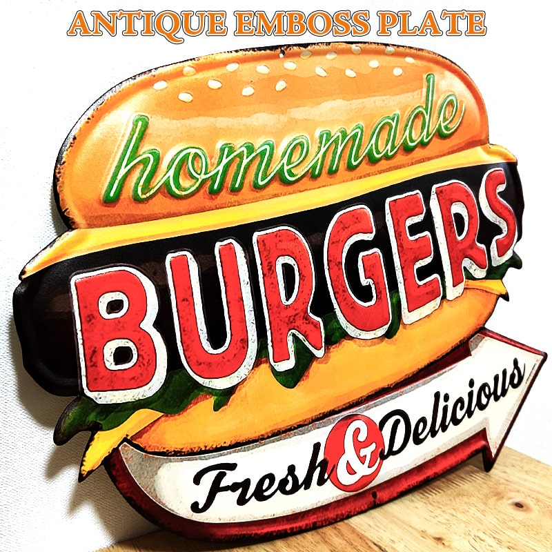 ブリキ看板 ハンバーガー アンティーク かわいい BURGERS アメリカン ビンテージ 壁掛け プレート 壁飾り 雑貨 大きい インテリア 可愛い サーファー カフェ 店舗