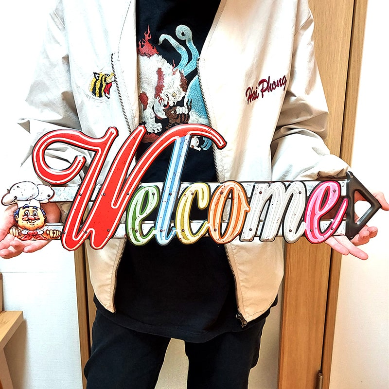 WELCOMEロゴの隣のコックさんがワンポイントになっており目を引くとても可愛いデザインです。