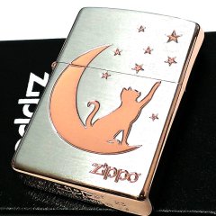 ZIPPO 月とネコ ピンクゴールド 猫 ジッポ ライター シルバー ロゴ おしゃれ レディース ねこ かわいい 星 彫刻 女性 シンプル 可愛い ギフト プレゼント [1201S878]