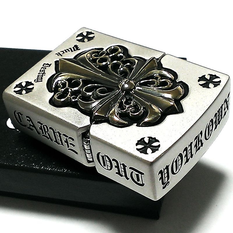 ZIPPO ライター メタルジャケット ジッポ 超重厚 クロス シルバー&ゴールド 5面デザイン 艶消し 彫刻 メンズ 銀 十字架 アクセサリー かっこいい ギフト