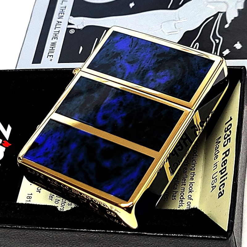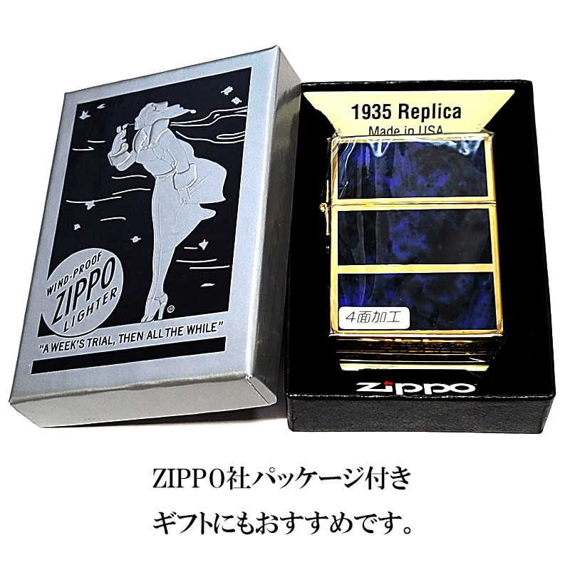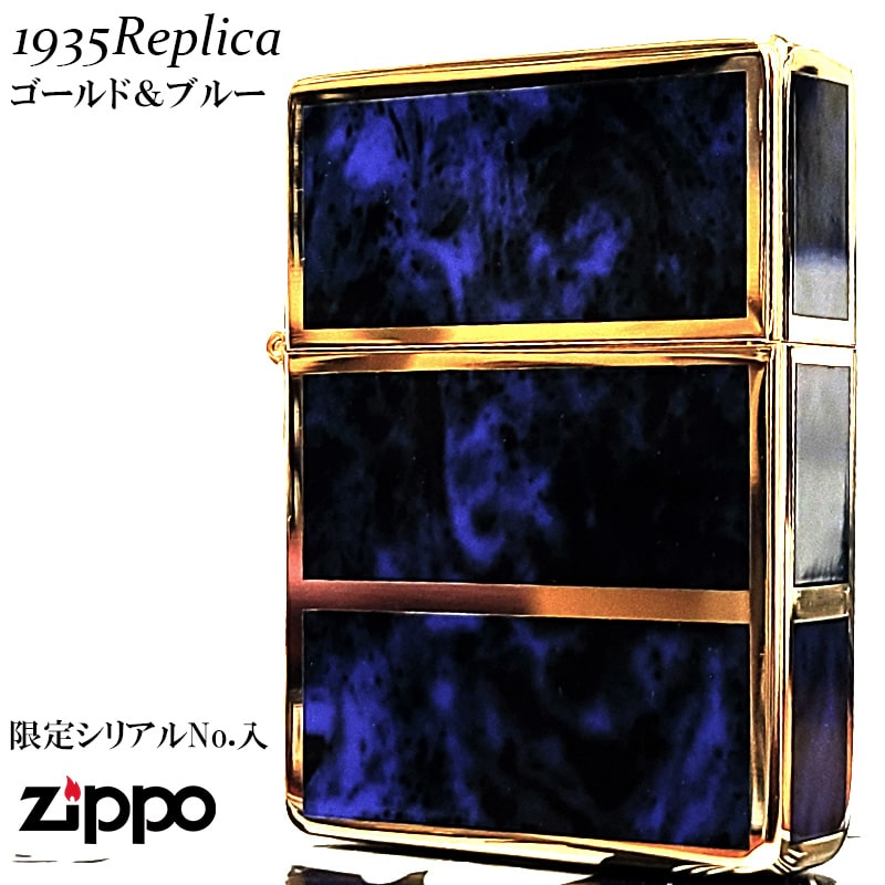 ZIPPO ライター 限定 1935 復刻レプリカ ジッポー ゴールド&ブルー かっこいい 4面加工 シリアルナンバー入り 角型 動画有り ギフト プレゼント 3バレル おしゃれ メンズ